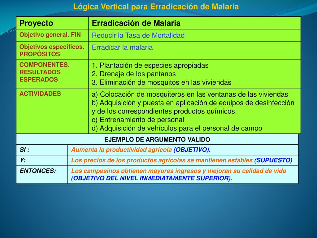 JERARQUIA DE OBJETIVOS DE PROYECTOS:La lógica vertical funciona a la inversa (de una lógica de “Planificación”), parte desde: FIN- ¿PARA QUE?Razón del proyecto. Objetivo superior al cual contribuye. Ejemplo: Cambios en la Situación Nacional en Salud.PROPOSITO - ¿POR QUE?El impacto (efecto inmediato) del Proyecto. Ejemplo: Cambios en las Capacidades Nacionales. RESULTADOS - ¿QUE? Resultados (productos) específicos producidos por el proyecto. Responsabilidad Gerencial. ACTIVIDADES - ¿COMO? Acciones y recursos que debe ejecutar el proyecto para producir el resultado. Responsabilidad Gerencial. Ejemplo: FIN (Objetivo general) Se han eliminado las enfermedades causadas por agua contaminada. PROPOSITO (Objetivos específicos) La población rural ha adoptado prácticas higiénicas PRODUCTOS o RESULTADOS 1. Trabajadores de la salud capacitados 2. La comunidad ha sido informada sobre técnicas de tratamiento de agua ACTIVIDADES 1.1 Capacitaciones 1.2 Realizar cursos para los trabajadores de salud sobre tratamiento de agua 2.1 Diseminar técnicas de tratamiento de agua. 2.2 Realizar talleres con la comunidad