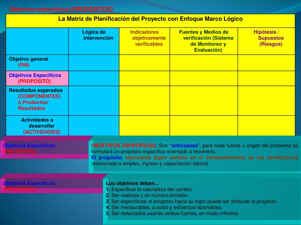 Objetivos Específicos (PROPÓSITO) Objetivos Específicos(PROPÓSITO) OBJETIVOS ESPECÍFICOS: Son “anticuasas”, para cada fuente u origen del problema se formulará un propósito específico orientado a resolverlo. El propósitorepresenta algún cambio en el comportamiento de los beneficiarios relacionado a empleo, ingreso y capacitación laboral. Los objetivos deben... 1. Especificar la naturaleza del cambio. 2. Ser realistas y en número limitado. 3. Ser específicos: el progreso hacia su logro pueda ser atribuido al proyecto. 4. Ser mensurables, a costo y esfuerzos razonables. 5. Ser redactados usando verbos fuertes, en modo infinitivo