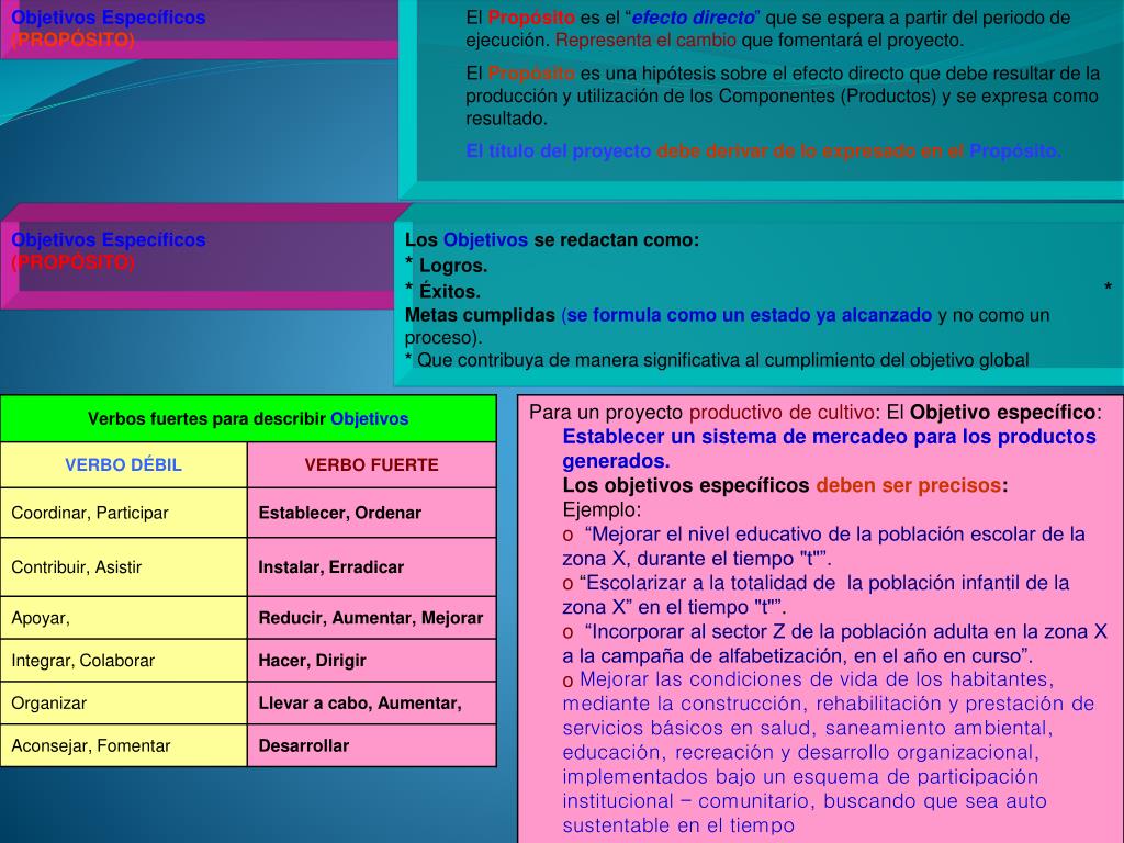 Objetivos Específicos (PROPÓSITO) Objetivos Específicos (PROPÓSITO) • El Propósito es el “efecto directo” que se espera a partir del periodo de ejecución. Representa el cambio que fomentará el proyecto. • El Propósito es una hipótesis sobre el efecto directo que debe resultar de la producción y utilización de los Componentes (Productos) y se expresa como resultado. • Eltítulo del proyecto debe derivar de lo expresado en el Propósito. Los Objetivos se redactan como:* Logros. * Éxitos.* Metas cumplidas (se formula como un estado ya alcanzado y no como un proceso). *Que contribuya de manera significativa al cumplimiento del objetivo global