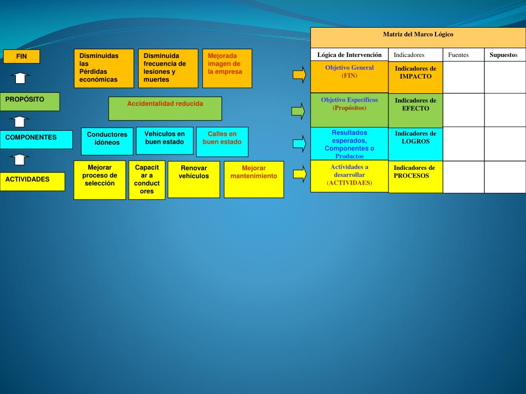 Matriz del Marco Lógico Lógica de Intervención Indicadores Fuentes Supuestos Disminuidas las Pérdidas económicas Disminuida frecuencia de lesiones y muertes Mejorada imagen de la empresa FIN Objetivo General(FIN) Indicadores de IMPACTO PROPÓSITO Objetivo Específicos(Propósitos) Indicadores de EFECTO Accidentalidad reducida Resultados esperados, Componentes o Productos(RESULTADOS) Indicadores de LOGROS Vehículos en buen estado Calles en buen estado Conductores idóneos COMPONENTES Actividades a desarrollar(ACTIVIDAES) Mejorar proceso de selección Capacitar a conductores Indicadores de PROCESOS Renovar vehículos Mejorar mantenimiento ACTIVIDADES