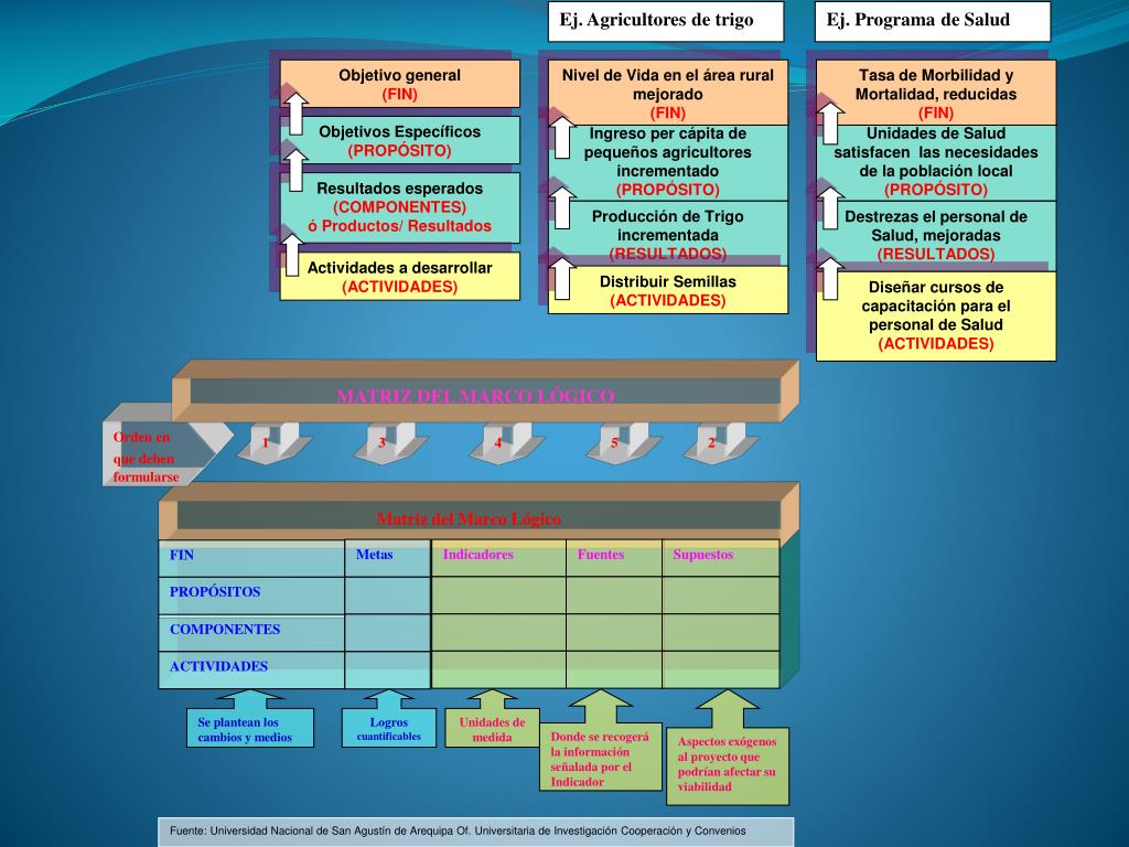 Nivel de Vida en el área rural mejorado(FIN) Objetivo general(FIN) Objetivos Específicos(PROPÓSITO) Ingreso per cápitade pequeños agricultores incrementado(PROPÓSITO) Ej. Agricultores de trigo Ej. Programa de Salud Tasa de Morbilidad y Mortalidad, reducidas(FIN) Resultados esperados(COMPONENTES)ó Productos/ Resultados Producción de Trigoincrementada (RESULTADOS) Unidades de Salud satisfacen las necesidades de la población local(PROPÓSITO) Actividades a desarrollar(ACTIVIDADES) Distribuir Semillas(ACTIVIDADES) Destrezas el personal de Salud, mejoradas(RESULTADOS) Diseñar cursos de capacitación para el personal de Salud(ACTIVIDADES) Orden en que debenformularse Se plantean los cambios y medios Logros cuantificables Unidades de medida Donde se recogerá la información señalada por el Indicador Aspectos exógenos al proyecto que podrían afectar su viabilidad 1 3 4 5 2 MATRIZ DEL MARCO LÓGICO Matriz del Marco Lógico Metas FIN Indicadores Fuentes Supuestos PROPÓSITOS COMPONENTES ACTIVIDADES Fuente: Universidad Nacional de San Agustín de Arequipa Of. Universitaria de Investigación Cooperación y Convenios