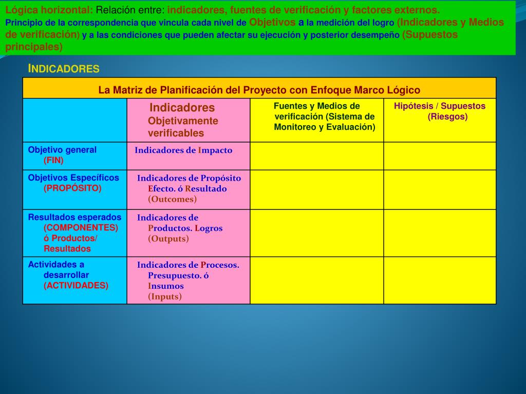 Lógica horizontal: Relación entre: indicadores, fuentes de verificación y factores externos. Principio de la correspondencia que vincula cada nivel de Objetivosa la medición del logro (Indicadores y Medios de verificación) y a las condiciones que pueden afectar su ejecución y posterior desempeño (Supuestos principales)