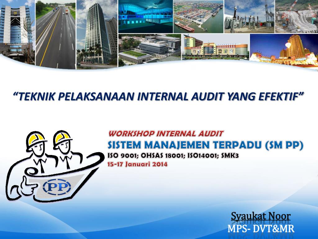“TEKNIK PELAKSANAAN INTERNAL AUDIT YANG EFEKTIF” • WORKSHOP INTERNAL AUDIT • SISTEM MANAJEMEN TERPADU (SM PP) • ISO 9001; OHSAS 18001; ISO14001; SMK3 • 15-17 Januari 2014 SyaukatNoor MPS- DVT&MR