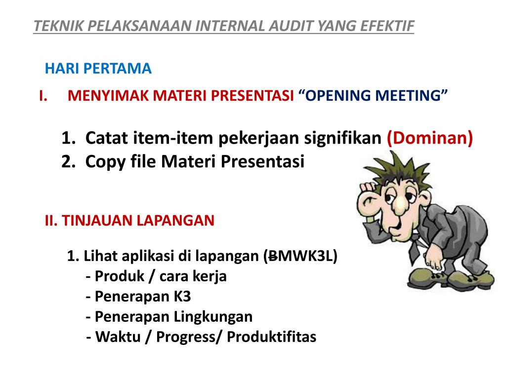 TEKNIK PELAKSANAAN INTERNAL AUDIT YANG EFEKTIF HARI PERTAMA MENYIMAK MATERI PRESENTASI “OPENING MEETING” 1. Catat item-item pekerjaansignifikan(Dominan) 2. Copy file MateriPresentasi II. TINJAUAN LAPANGAN 1. Lihataplikasidilapangan (BMWK3L) - Produk / carakerja - Penerapan K3 - PenerapanLingkungan - Waktu / Progress/ Produktifitas