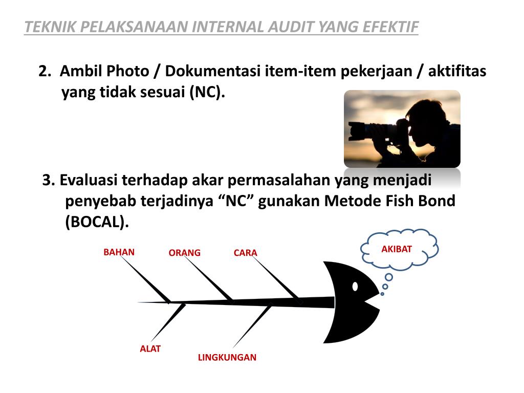 TEKNIK PELAKSANAAN INTERNAL AUDIT YANG EFEKTIF 2. Ambil Photo / Dokumentasi item-item pekerjaan / aktifitas yang tidaksesuai (NC). AKIBAT BAHAN ORANG CARA 3. Evaluasiterhadapakarpermasalahan yang menjadipenyebabterjadinya “NC” gunakanMetode Fish Bond (BOCAL). ALAT LINGKUNGAN
