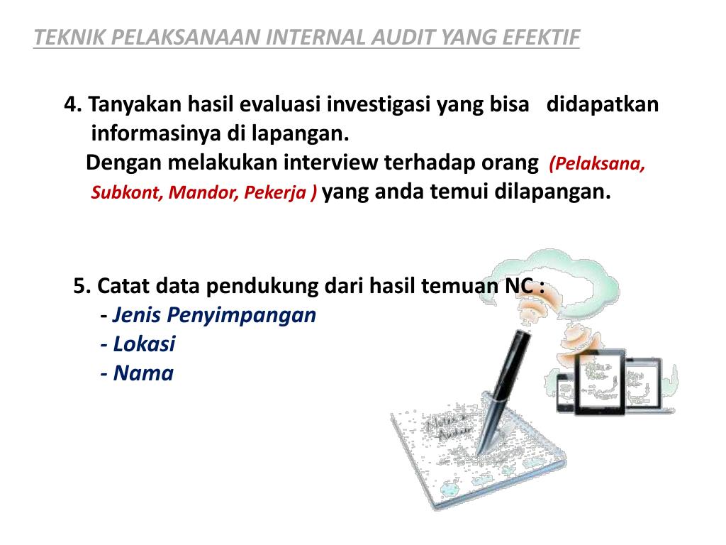 TEKNIK PELAKSANAAN INTERNAL AUDIT YANG EFEKTIF 4. Tanyakanhasilevaluasiinvestigasi yang bisadidapatkan informasinyadilapangan. Denganmelakukan interview terhadaporang (Pelaksana, Subkont, Mandor, Pekerja ) yang andatemuidilapangan. 5. Catat data pendukungdarihasiltemuan NC : - JenisPenyimpangan - Lokasi - Nama