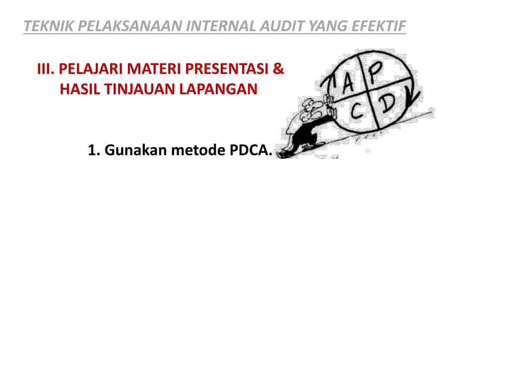 TEKNIK PELAKSANAAN INTERNAL AUDIT YANG EFEKTIF III. PELAJARI MATERI PRESENTASI & HASIL TINJAUAN LAPANGAN 1. Gunakanmetode PDCA.