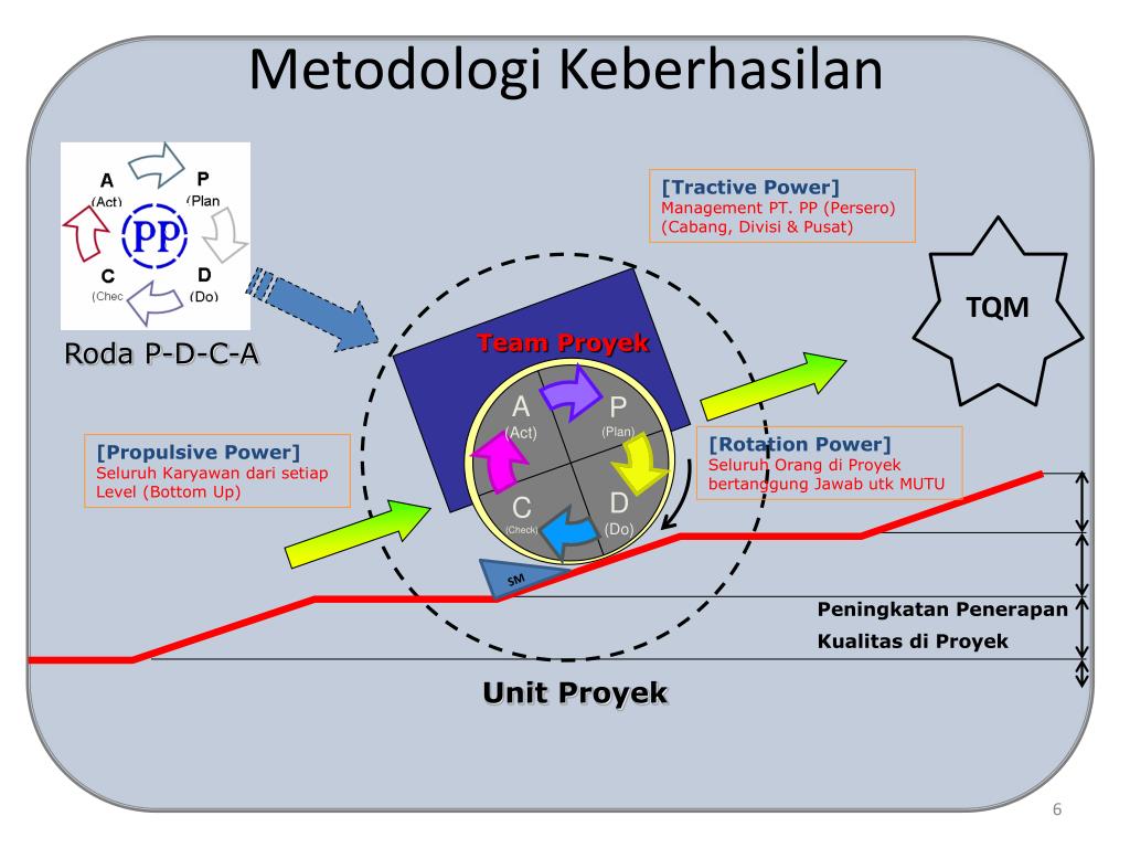 MetodologiKeberhasilan [Tractive Power] Management PT. PP (Persero) (Cabang, Divisi & Pusat) TQM Team Proyek Roda P-D-C-A [Rotation Power] Seluruh Orang di Proyek bertanggung Jawab utk MUTU [Propulsive Power] Seluruh Karyawan dari setiap Level (Bottom Up) SM Peningkatan Penerapan Kualitas di Proyek Unit Proyek