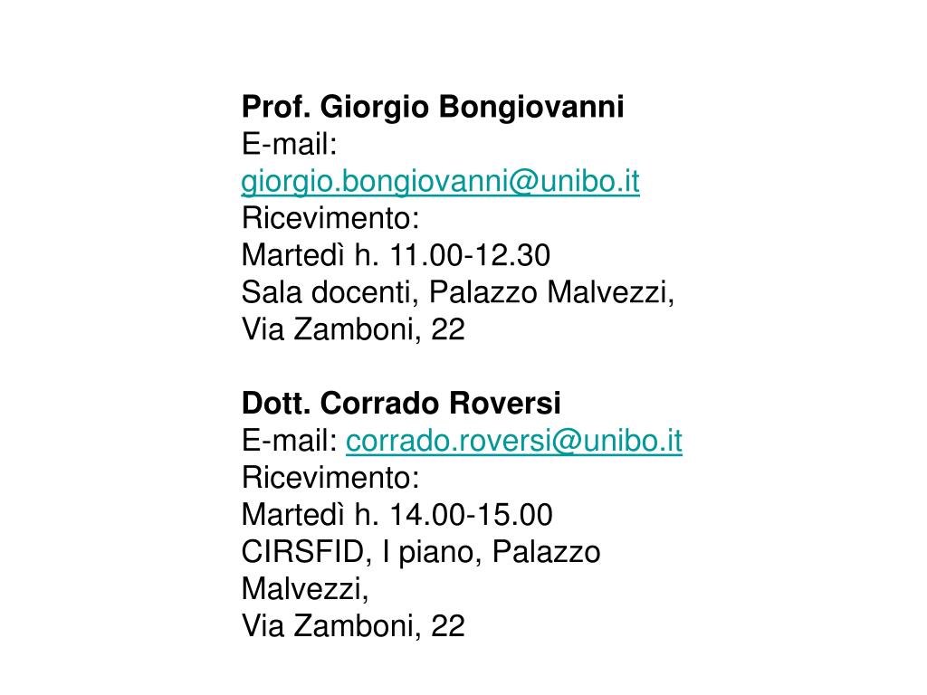 Prof. Giorgio Bongiovanni E-mail: giorgio.bongiovanni@unibo.it Ricevimento: Martedì h. 11.00-12.30 Sala docenti, Palazzo Malvezzi, Via Zamboni, 22 Dott. Corrado Roversi E-mail: corrado.roversi@unibo.it Ricevimento: Martedì h. 14.00-15.00 CIRSFID, I piano, Palazzo Malvezzi, Via Zamboni, 22