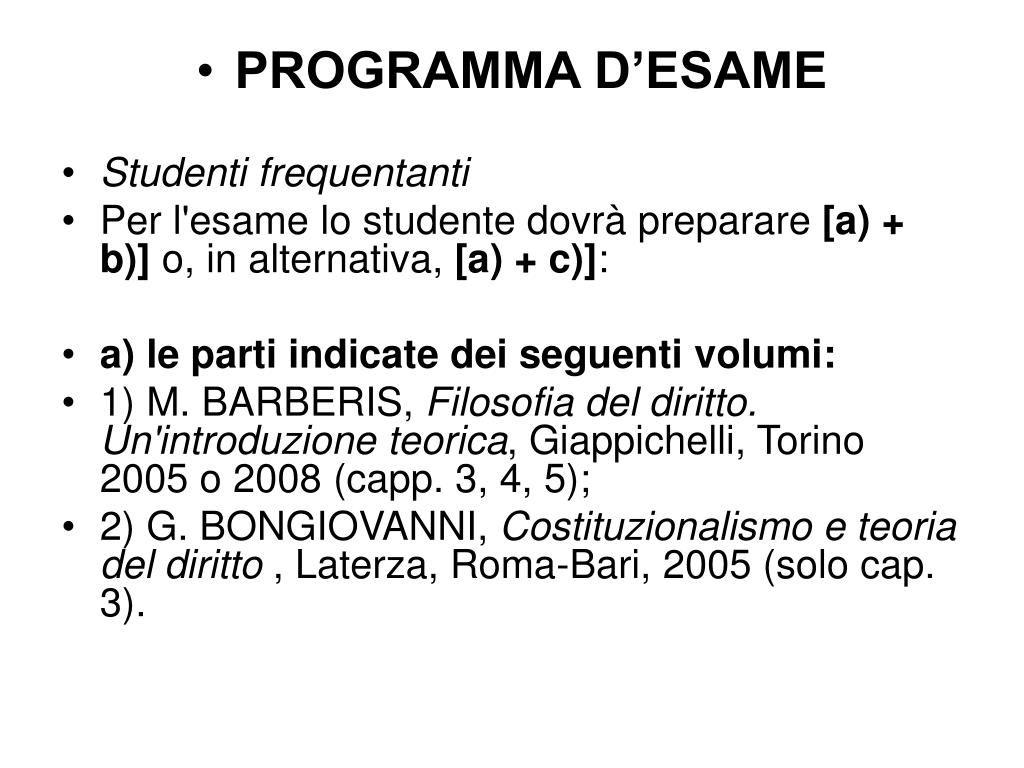 PROGRAMMA D’ESAME • Studenti frequentanti • Per l'esame lo studente dovrà preparare [a) + b)] o, in alternativa, [a) + c)]: • a) le parti indicate dei seguenti volumi: • 1) M. BARBERIS, Filosofia del diritto. Un'introduzione teorica, Giappichelli, Torino 2005 o 2008 (capp. 3, 4, 5); • 2) G. BONGIOVANNI, Costituzionalismo e teoria del diritto , Laterza, Roma-Bari, 2005 (solo cap. 3).