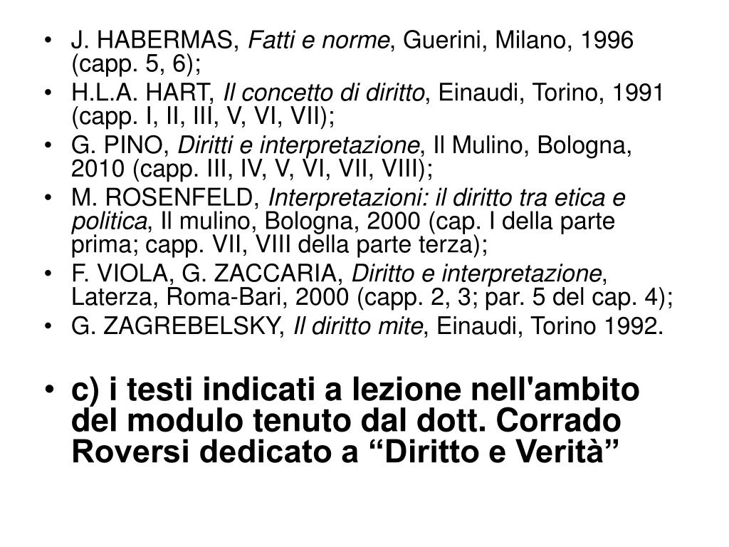 J. HABERMAS, Fatti e norme, Guerini, Milano, 1996 (capp. 5, 6); • H.L.A. HART, Il concetto di diritto, Einaudi, Torino, 1991 (capp. I, II, III, V, VI, VII); • G. PINO, Diritti e interpretazione, Il Mulino, Bologna, 2010 (capp. III, IV, V, VI, VII, VIII); • M. ROSENFELD, Interpretazioni: il diritto tra etica e politica, Il mulino, Bologna, 2000 (cap. I della parte prima; capp. VII, VIII della parte terza); • F. VIOLA, G. ZACCARIA, Diritto e interpretazione, Laterza, Roma-Bari, 2000 (capp. 2, 3; par. 5 del cap. 4); • G. ZAGREBELSKY, Il diritto mite, Einaudi, Torino 1992. • c) i testi indicati a lezione nell'ambito del modulo tenuto dal dott. Corrado Roversi dedicato a “Diritto e Verità”
