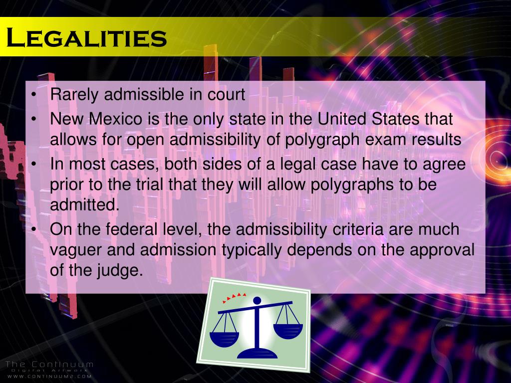 Legalities • Rarely admissible in court • New Mexico is the only state in the United States that allows for open admissibility of polygraph exam results • In most cases, both sides of a legal case have to agree prior to the trial that they will allow polygraphs to be admitted. • On the federal level, the admissibility criteria are much vaguer and admission typically depends on the approval of the judge.