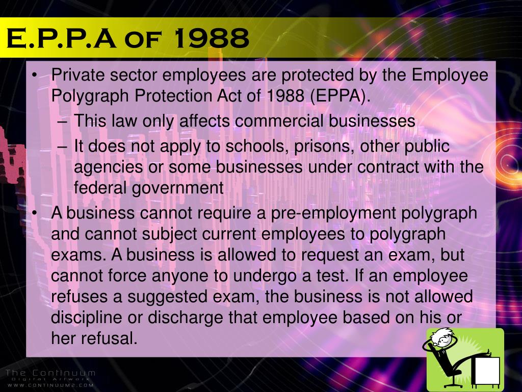 E.P.P.A of 1988 • Private sector employees are protected by the Employee Polygraph Protection Act of 1988 (EPPA). • This law only affects commercial businesses • It does not apply to schools, prisons, other public agencies or some businesses under contract with the federal government • A business cannot require a pre-employment polygraph and cannot subject current employees to polygraph exams. A business is allowed to request an exam, but cannot force anyone to undergo a test. If an employee refuses a suggested exam, the business is not allowed discipline or discharge that employee based on his or her refusal.