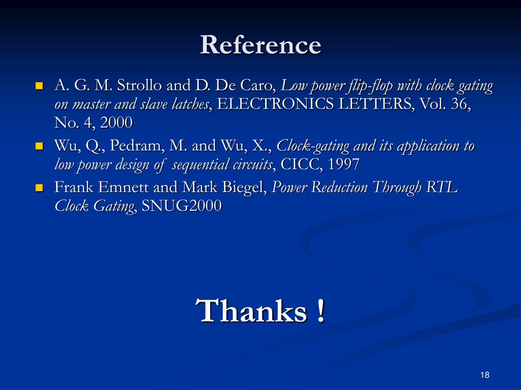 Reference • A. G. M. Strollo and D. De Caro, Low power flip-flop with clock gating on master and slave latches, ELECTRONICS LETTERS, Vol. 36, No. 4, 2000 • Wu, Q., Pedram, M. and Wu, X., Clock-gating and its application to low power design of sequential circuits, CICC, 1997 • Frank Emnett and Mark Biegel, Power Reduction Through RTL Clock Gating, SNUG2000 Thanks !