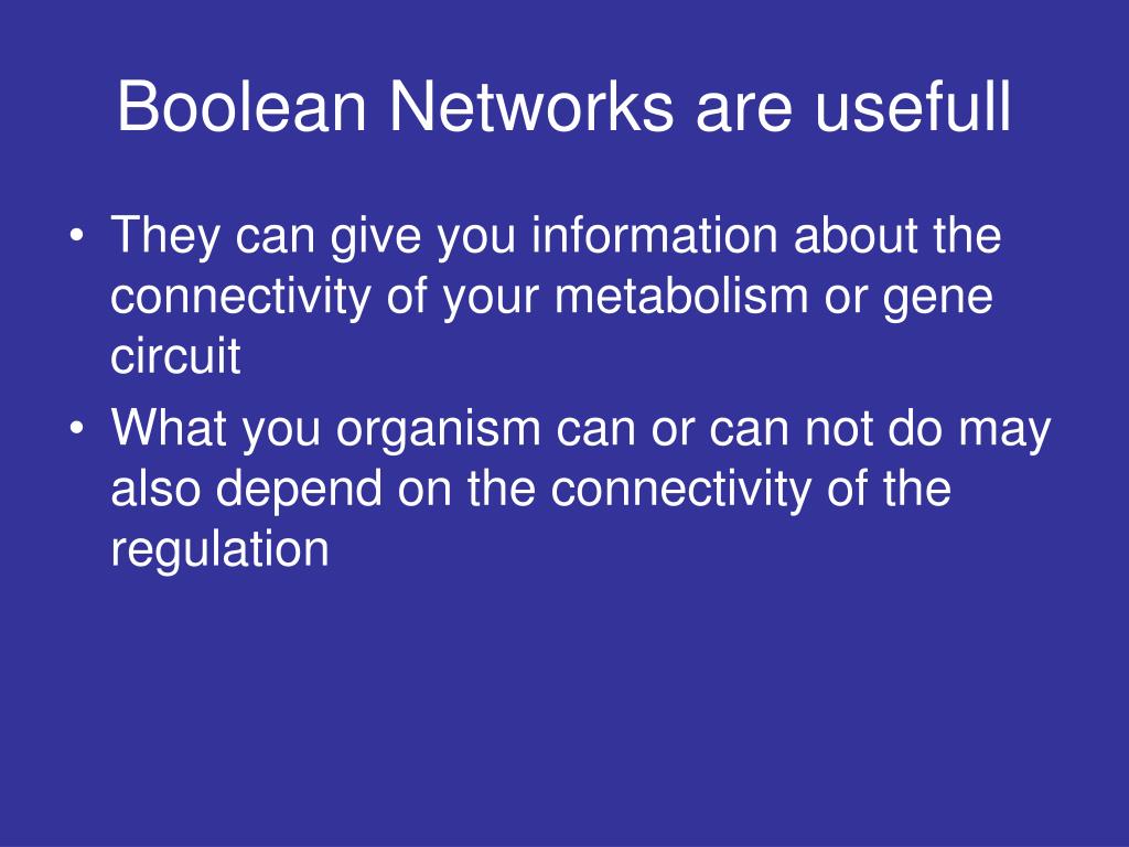 Boolean Networks are usefull • They can give you information about the connectivity of your metabolism or gene circuit • What you organism can or can not do may also depend on the connectivity of the regulation
