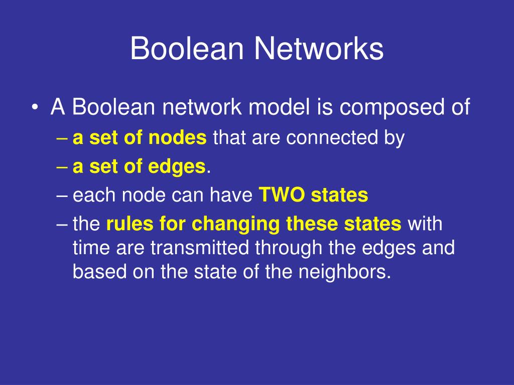Boolean Networks • A Boolean network model is composed of • a set of nodes that are connected by • a set of edges. • each node can have TWO states • the rules for changing these states with time are transmitted through the edges and based on the state of the neighbors.