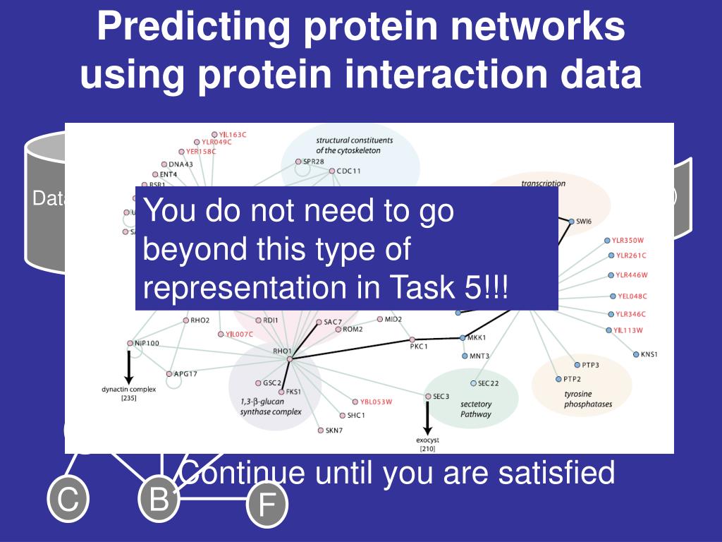 E D A C B F Predicting protein networks using protein interaction data Database of protein interactions Your Sequence (A) Server/ Program You do not need to go beyond this type of representation in Task 5!!! Continue until you are satisfied