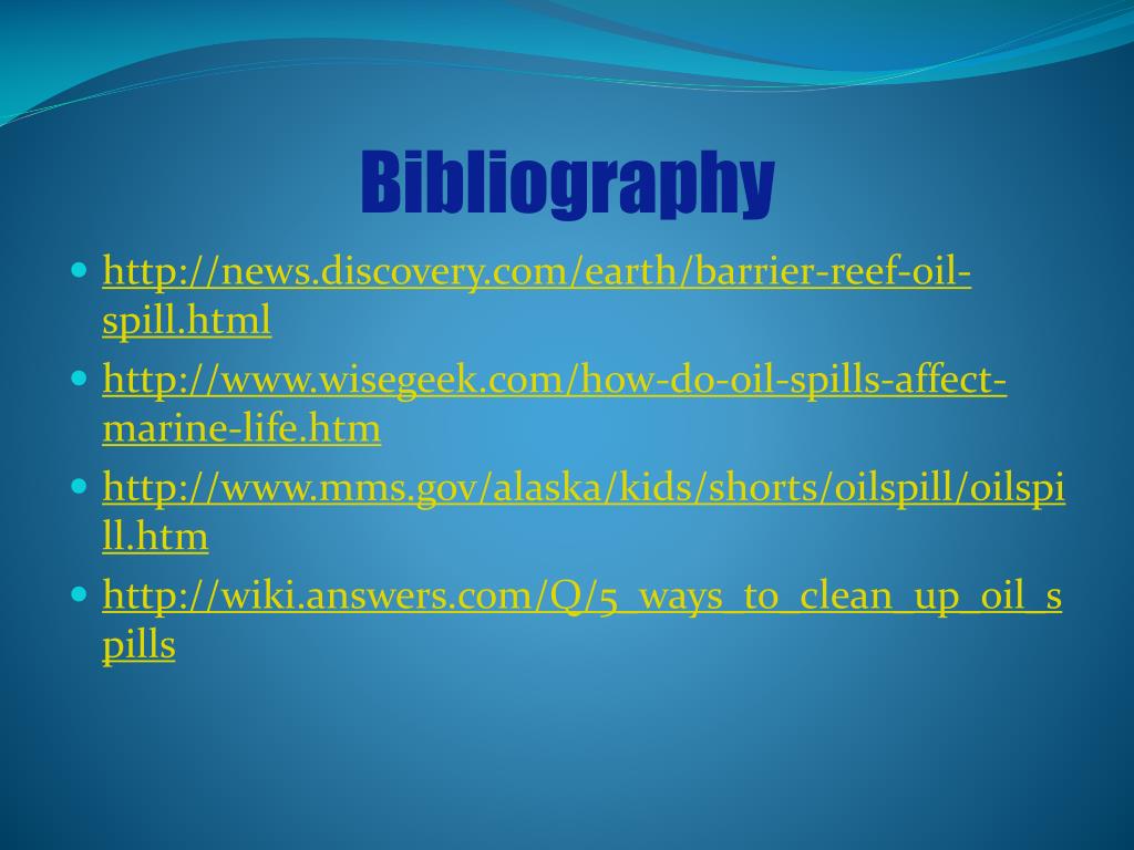 Bibliography • http://news.discovery.com/earth/barrier-reef-oil-spill.html • http://www.wisegeek.com/how-do-oil-spills-affect-marine-life.htm • http://www.mms.gov/alaska/kids/shorts/oilspill/oilspill.htm • http://wiki.answers.com/Q/5_ways_to_clean_up_oil_spills