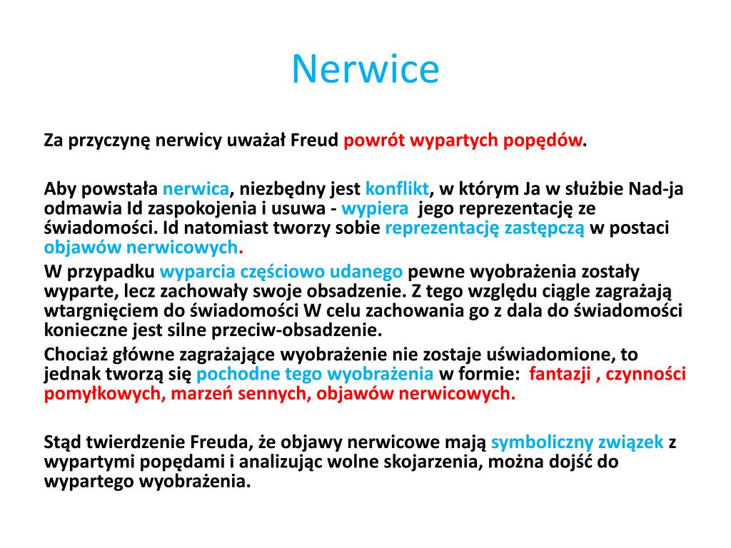 Nerwice Za przyczynę nerwicy uważał Freudpowrót wypartych popędów. Aby powstała nerwica, niezbędny jest konflikt, w którym Ja w służbie Nad-ja odmawia Id zaspokojenia i usuwa - wypiera jego reprezentację ze świadomości. Id natomiast tworzy sobie reprezentację zastępczą w postaci objawów nerwicowych. W przypadku wyparcia częściowo udanego pewne wyobrażenia zostały wyparte, lecz zachowały swoje obsadzenie. Z tego względu ciągle zagrażają wtargnięciem do świadomości W celu zachowania go z dala do świadomości konieczne jest silne przeciw-obsadzenie. Chociaż główne zagrażające wyobrażenie nie zostaje uświadomione, to jednak tworzą się pochodne tego wyobrażenia w formie: fantazji , czynności pomyłkowych, marzeń sennych, objawów nerwicowych. Stąd twierdzenie Freuda, że objawy nerwicowe mają symboliczny związek z wypartymi popędami i analizując wolne skojarzenia, można dojść do wypartego wyobrażenia.