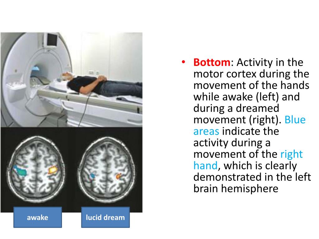 awake luciddream Bottom: Activity in the motor cortex during the movement of the hands while awake (left) and during a dreamed movement (right). Blue areas indicate the activity during a movement of the right hand, which is clearly demonstrated in the left brain hemisphere