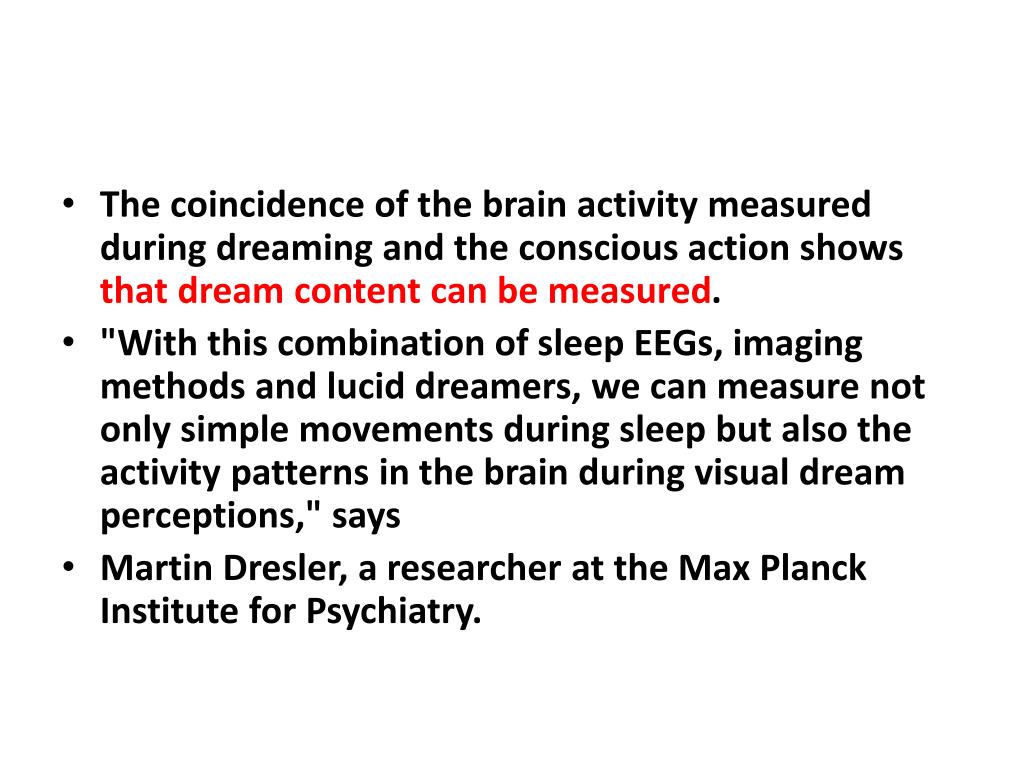 The coincidence of the brain activity measured during dreaming and the conscious action shows that dream content can be measured. • "With this combination of sleep EEGs, imaging methods and lucid dreamers, we can measure not only simple movements during sleep but also the activity patterns in the brain during visual dream perceptions," says • Martin Dresler, a researcher at the Max Planck Institute for Psychiatry.