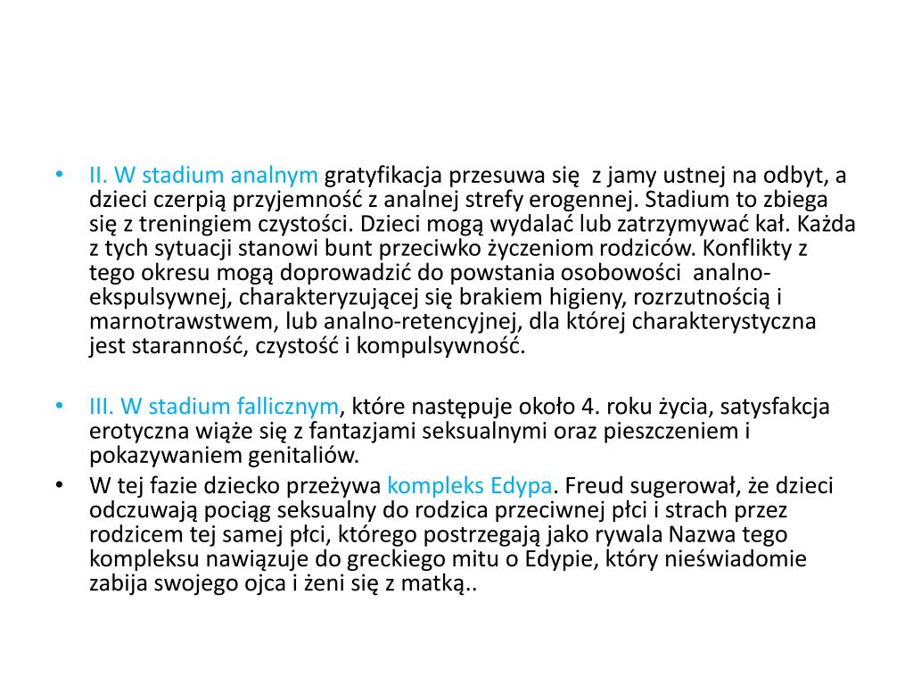 II. W stadium analnym gratyfikacja przesuwa się z jamy ustnej na odbyt, a dzieci czerpią przyjemność z analnej strefy erogennej. Stadium to zbiega się z treningiem czystości. Dzieci mogą wydalać lub zatrzymywać kał. Każda z tych sytuacji stanowi bunt przeciwko życzeniom rodziców. Konflikty z tego okresu mogą doprowadzić do powstania osobowości analno-ekspulsywnej, charakteryzującej się brakiem higieny, rozrzutnością i marnotrawstwem, lub analno-retencyjnej, dla której charakterystyczna jest staranność, czystość i kompulsywność. • III. W stadium fallicznym, które następuje około 4. roku życia, satysfakcja erotyczna wiąże się z fantazjami seksualnymi oraz pieszczeniem i pokazywaniem genitaliów. • W tej fazie dziecko przeżywa kompleks Edypa. Freud sugerował, że dzieci odczuwają pociąg seksualny do rodzica przeciwnej płci i strach przez rodzicem tej samej płci, którego postrzegają jako rywalaNazwa tego kompleksu nawiązuje do greckiego mitu o Edypie, który nieświadomie zabija swojego ojca i żeni się z matką..