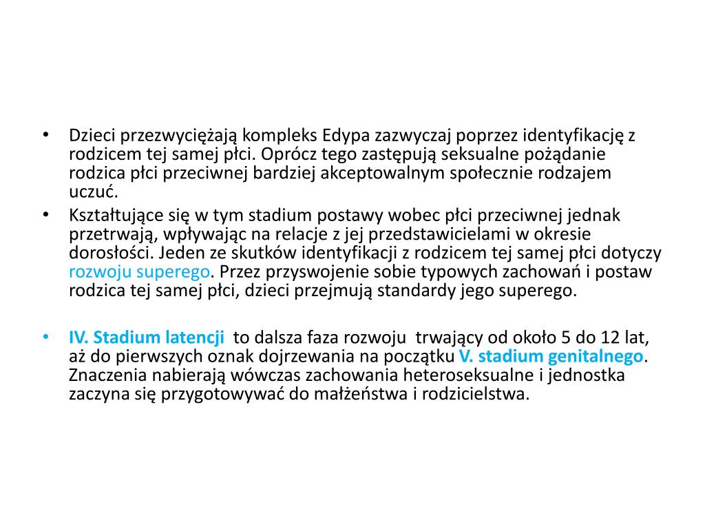 Dzieci przezwyciężają kompleks Edypa zazwyczaj poprzez identyfikację z rodzicem tej samej płci. Oprócz tego zastępują seksualne pożądanie rodzica płci przeciwnej bardziej akceptowalnym społecznie rodzajem uczuć. • Kształtujące się w tym stadium postawy wobec płci przeciwnej jednak przetrwają, wpływając na relacje z jej przedstawicielami w okresie dorosłości. Jeden ze skutków identyfikacji z rodzicem tej samej płci dotyczy rozwoju superego. Przez przyswojenie sobie typowych zachowań i postaw rodzica tej samej płci, dzieci przejmują standardy jego superego. • IV. Stadium latencji to dalsza faza rozwoju trwający od około 5 do 12 lat, aż do pierwszych oznak dojrzewania na początku V. stadium genitalnego. Znaczenia nabierają wówczas zachowania heteroseksualne i jednostka zaczyna się przygotowywać do małżeństwa i rodzicielstwa.