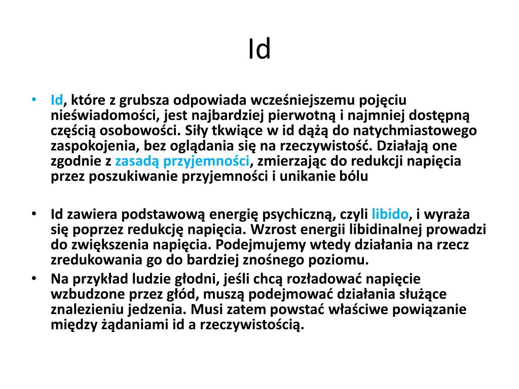 Id • Id, które z grubsza odpowiada wcześniejszemu pojęciu nieświadomości, jest najbardziej pierwotną i najmniej dostępną częścią osobowości. Siły tkwiące w id dążą do natychmiastowego zaspokojenia, bez oglądania się na rzeczywistość. Działają one zgodnie z zasadą przyjemności, zmierzając do redukcji napięcia przez poszukiwanie przyjemności i unikanie bólu • Id zawiera podstawową energię psychiczną, czyli libido, i wyraża się poprzez redukcję napięcia. Wzrost energii libidinalnej prowadzi do zwiększenia napięcia. Podejmujemy wtedy działania na rzecz zredukowania go do bardziej znośnego poziomu. • Na przykład ludzie głodni, jeśli chcą rozładować napięcie wzbudzone przez głód, muszą podejmować działania służące znalezieniu jedzenia. Musi zatem powstać właściwe powiązanie między żądaniami id a rzeczywistością.