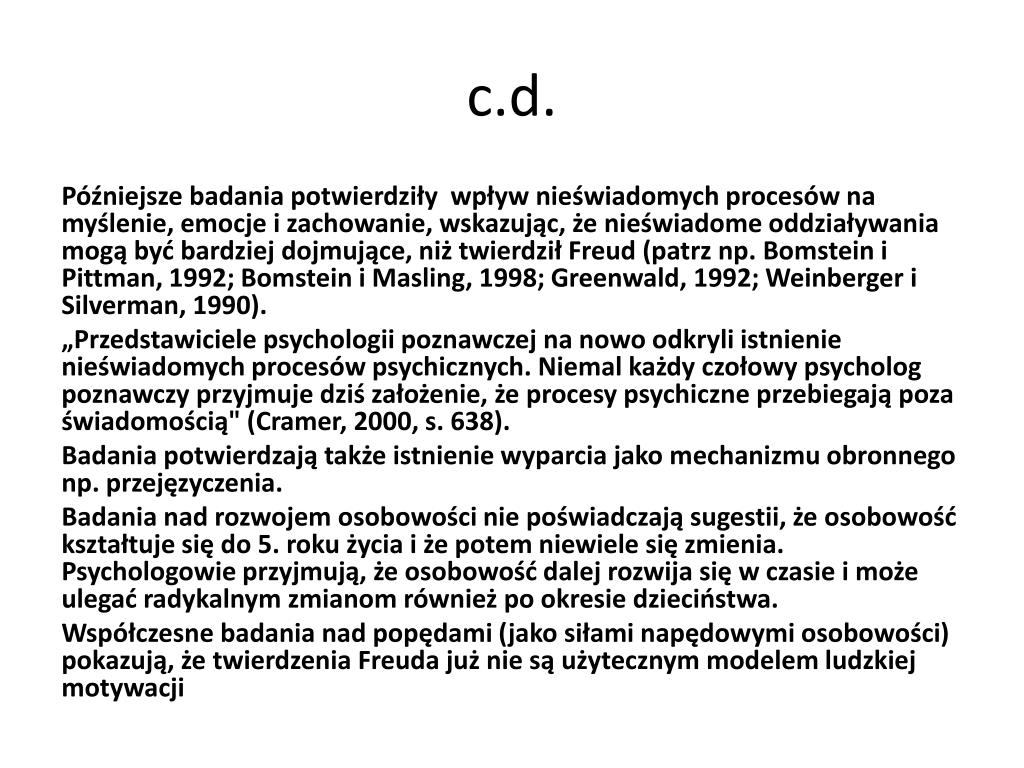 c.d. Późniejsze badania potwierdziły wpływ nieświadomych procesów na myślenie, emocje i zachowanie, wskazując, że nieświadome oddziaływania mogą być bardziej dojmujące, niż twierdził Freud (patrz np. Bomstein i Pittman, 1992; Bomstein i Masling, 1998; Greenwald, 1992; Weinberger i Silverman, 1990). „Przedstawiciele psychologii poznawczej na nowo odkryli istnienie nieświadomych procesów psychicznych. Niemal każdy czołowy psycholog poznawczy przyjmuje dziś założenie, że procesy psychiczne przebiegają poza świadomością" (Cramer, 2000, s. 638). Badania potwierdzają także istnienie wyparcia jako mechanizmu obronnego np. przejęzyczenia. Badania nad rozwojem osobowości nie poświadczają sugestii, że osobowość kształtuje się do 5. roku życia i że potem niewiele się zmienia. Psychologowie przyjmują, że osobowość dalej rozwija się w czasie i może ulegać radykalnym zmianom również po okresie dzieciństwa. Współczesne badania nad popędami (jako siłami napędowymi osobowości) pokazują, że twierdzenia Freuda już nie są użytecznym modelem ludzkiej motywacji