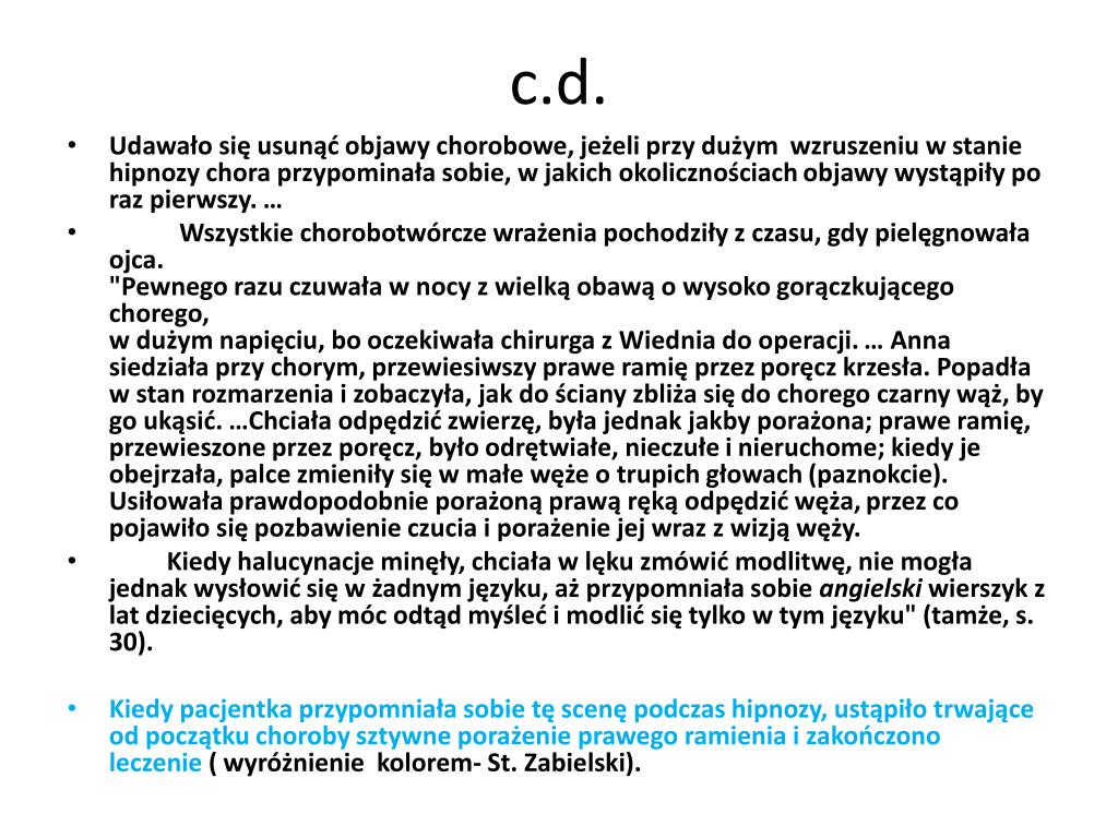 c.d. • Udawało się usunąć objawy chorobowe, jeżeli przy dużym wzruszeniu w stanie hipnozy chora przypominała sobie, w jakich okolicznościach objawy wystąpiły po raz pierwszy. … • Wszystkie chorobotwórcze wrażenia pochodziły z czasu, gdy pielęgnowała ojca. "Pewnego razu czuwała w nocy z wielką obawą o wysoko gorączkującego chorego, w dużym napięciu, bo oczekiwała chirurga z Wiednia do operacji. … Anna siedziała przy chorym, przewiesiwszy prawe ramię przez poręcz krzesła. Popadła w stan rozmarzenia i zobaczyła, jak do ściany zbliża się do chorego czarny wąż, by go ukąsić. …Chciała odpędzić zwierzę, była jednak jakby porażona; prawe ramię, przewieszone przez poręcz, było odrętwiałe, nieczułe i nieruchome; kiedy je obejrzała, palce zmieniły się w małe węże o trupich głowach (paznokcie). Usiłowała prawdopodobnie porażoną prawą ręką odpędzić węża, przez co pojawiło się pozbawienie czucia i porażenie jej wraz z wizją węży. • Kiedy halucynacje minęły, chciała w lęku zmówić modlitwę, nie mogła jednak wysłowić się w żadnym języku, aż przypomniała sobie angielski wierszyk z lat dziecięcych, aby móc odtąd myśleć i modlić się tylko w tym języku" (tamże, s. 30). • Kiedy pacjentka przypomniała sobie tę scenę podczas hipnozy, ustąpiło trwające od początku choroby sztywne porażenie prawego ramienia i zakończono leczenie ( wyróżnienie kolorem- St. Zabielski).