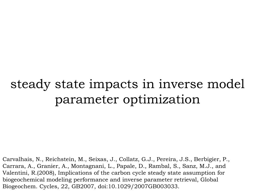 steady state impacts in inverse model parameter optimization Carvalhais, N., Reichstein, M., Seixas, J., Collatz, G.J., Pereira, J.S., Berbigier, P., Carrara, A., Granier, A., Montagnani, L., Papale, D., Rambal, S., Sanz, M.J., and Valentini, R.(2008), Implications of the carbon cycle steady state assumption for biogeochemical modeling performance and inverse parameter retrieval, Global Biogeochem. Cycles, 22, GB2007, doi:10.1029/2007GB003033.