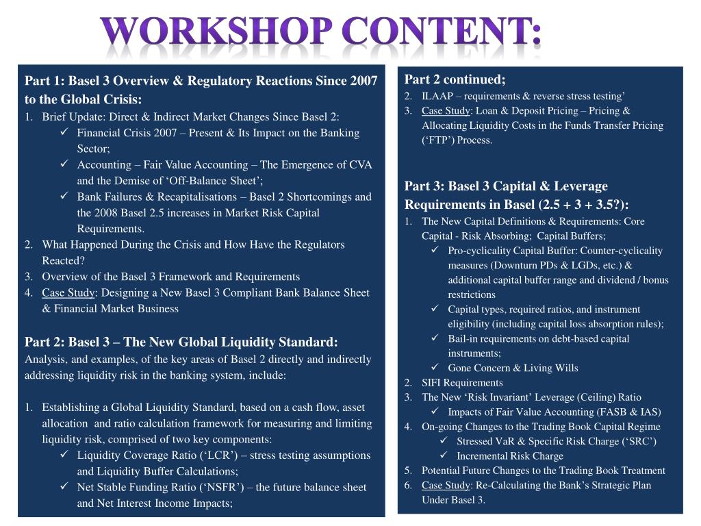 Workshop Content: Part 1: Basel 3 Overview & Regulatory Reactions Since 2007 to the Global Crisis: • Brief Update: Direct & Indirect Market Changes Since Basel 2: • Financial Crisis 2007 – Present & Its Impact on the Banking Sector; • Accounting – Fair Value Accounting – The Emergence of CVA and the Demise of ‘Off-Balance Sheet’; • Bank Failures & Recapitalisations – Basel 2 Shortcomings and the 2008 Basel 2.5 increases in Market Risk Capital Requirements. • What Happened During the Crisis and How Have the Regulators Reacted? • Overview of the Basel 3 Framework and Requirements • Case Study: Designing a New Basel 3 Compliant Bank Balance Sheet & Financial Market Business Part 2: Basel 3 – The New Global Liquidity Standard: Analysis, and examples, of the key areas of Basel 2 directly and indirectly addressing liquidity risk in the banking system, include: • Establishing a Global Liquidity Standard, based on a cash flow, asset allocation and ratio calculation framework for measuring and limiting liquidity risk, comprised of two key components: • Liquidity Coverage Ratio (‘LCR’) – stress testing assumptions and Liquidity Buffer Calculations; • Net Stable Funding Ratio (‘NSFR’) – the future balance sheet and Net Interest Income Impacts; • Part 2 continued; • ILAAP – requirements & reverse stress testing’ • Case Study: Loan & Deposit Pricing – Pricing & Allocating Liquidity Costs in the Funds Transfer Pricing (‘FTP’) Process. • Part 3: Basel 3 Capital & Leverage Requirements in Basel (2.5 + 3 + 3.5?): • The New Capital Definitions & Requirements: Core Capital - Risk Absorbing; Capital Buffers; • Pro-cyclicality Capital Buffer: Counter-cyclicality measures (Downturn PDs & LGDs, etc.) & additional capital buffer range and dividend / bonus restrictions • Capital types, required ratios, and instrument eligibility (including capital loss absorption rules); • Bail-in requirements on debt-based capital instruments; • Gone Concern & Living Wills • SIFI Requirements • The New ‘Risk Invariant’ Leverage (Ceiling) Ratio • Impacts of Fair Value Accounting (FASB & IAS) • On-going Changes to the Trading Book Capital Regime • Stressed VaR & Specific Risk Charge (‘SRC’) • Incremental Risk Charge • Potential Future Changes to the Trading Book Treatment • Case Study: Re-Calculating the Bank’s Strategic Plan Under Basel 3.