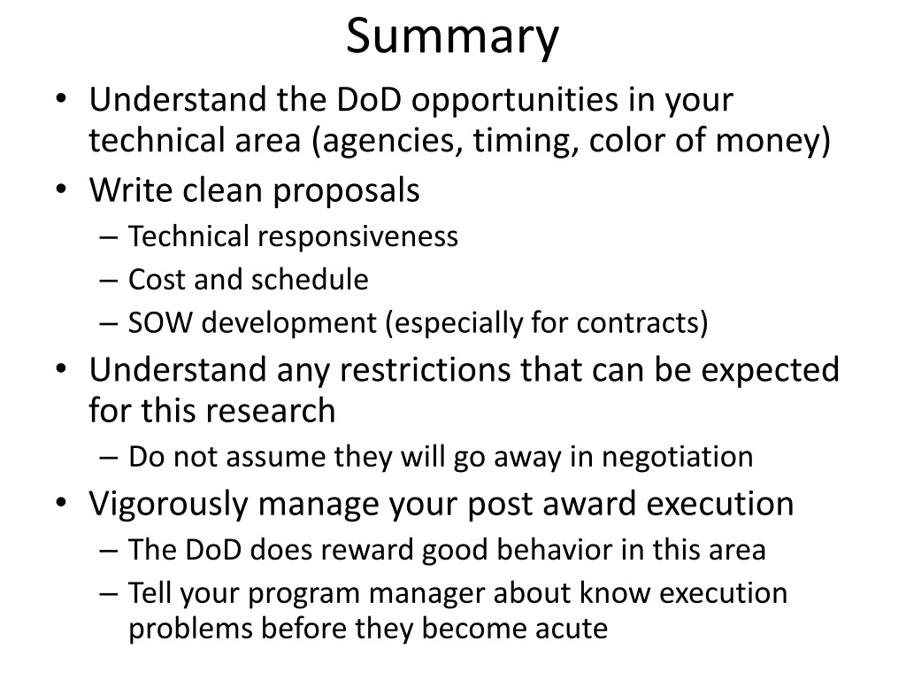 Summary • Understand the DoD opportunities in your technical area (agencies, timing, color of money) • Write clean proposals • Technical responsiveness • Cost and schedule • SOW development (especially for contracts) • Understand any restrictions that can be expected for this research • Do not assume they will go away in negotiation • Vigorously manage your post award execution • The DoD does reward good behavior in this area • Tell your program manager about know execution problems before they become acute