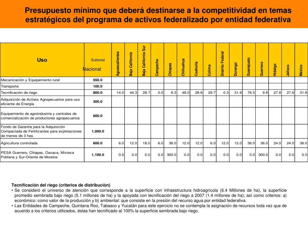 Presupuesto mínimo que deberá destinarse a la competitividad en temas estratégicos del programa de activos federalizado por entidad federativa Nacional • Tecnificación del riego (criterios de distribución) • Se consideró el universo de atención que corresponde a la superficie con infraestructura hidroagrícola (6.4 Millones de ha), la superficie promedio sembrada bajo riego (5.1 millones de ha) y la apoyada con tecnificación del riego a 2007 (1.4 millones de ha); así como criterios: a) económico: como valor de la producción y b) ambiental: que consiste en la presión del recurso agua por entidad federativa. • Las Entidades de Campeche, Quintana Roo, Tabasco y Yucatán para este ejercicio no se contempla la asignación de recursos toda vez que de acuerdo a los criterios utilizados, éstas han tecnificado al 100% la superficie sembrada bajo riego.