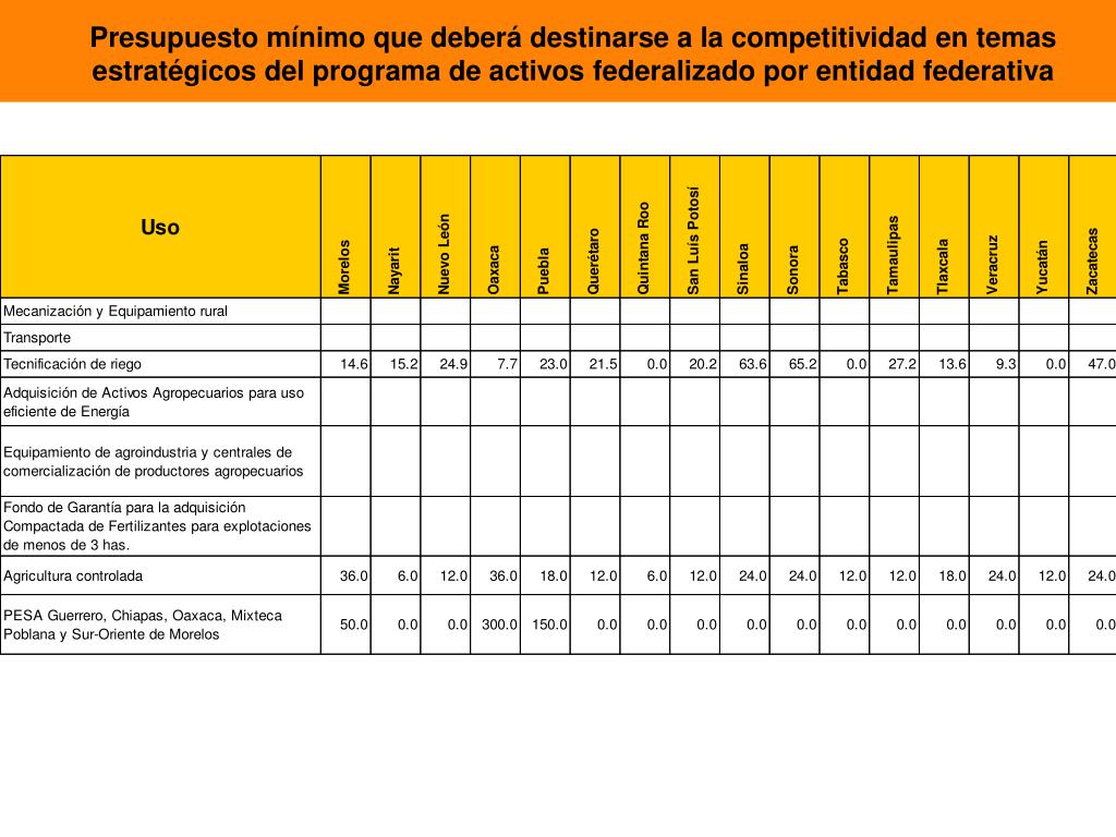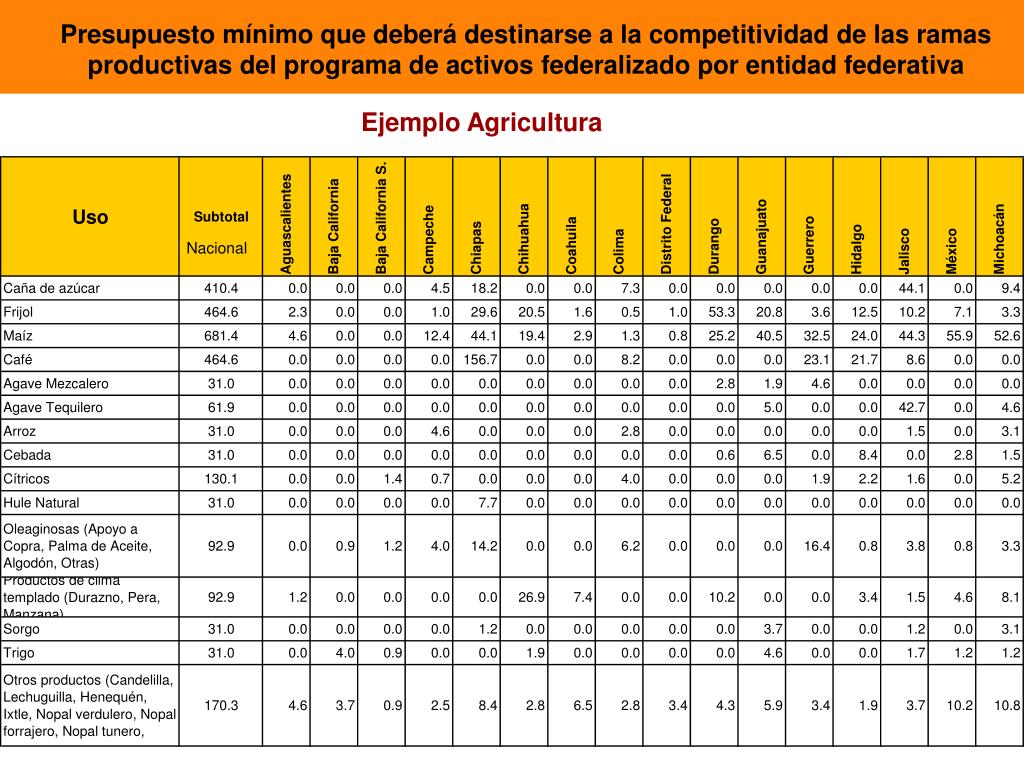Presupuesto mínimo que deberá destinarse a la competitividad de las ramas productivas del programa de activos federalizado por entidad federativa Ejemplo Agricultura Nacional