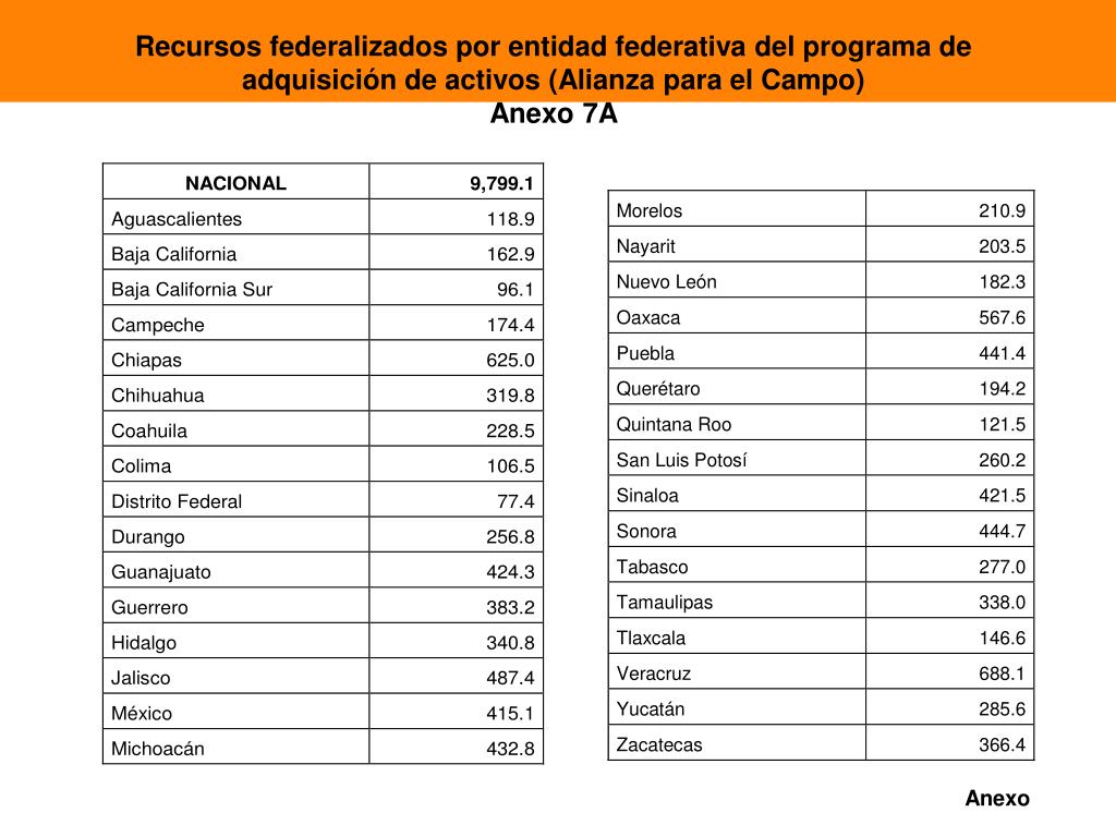 Recursos federalizados por entidad federativa del programa de adquisición de activos (Alianza para el Campo) Anexo 7A Anexo