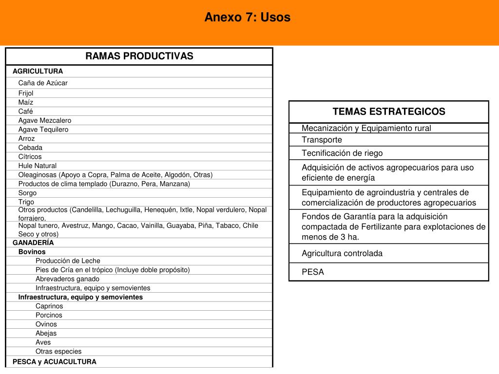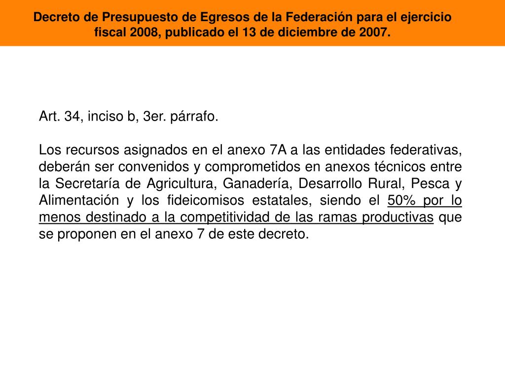 Decreto de Presupuesto de Egresos de la Federación para el ejercicio fiscal 2008, publicado el 13 de diciembre de 2007. Art. 34, inciso b, 3er. párrafo. Los recursos asignados en el anexo 7A a las entidades federativas, deberán ser convenidos y comprometidos en anexos técnicos entre la Secretaría de Agricultura, Ganadería, Desarrollo Rural, Pesca y Alimentación y los fideicomisos estatales, siendo el 50% por lo menos destinado a la competitividad de las ramas productivas que se proponen en el anexo 7 de este decreto.