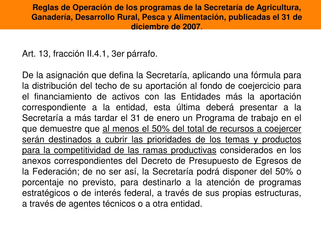 Reglas de Operación de los programas de la Secretaría de Agricultura, Ganadería, Desarrollo Rural, Pesca y Alimentación, publicadas el 31 de diciembre de 2007. Art. 13, fracción II.4.1, 3er párrafo. De la asignación que defina la Secretaría, aplicando una fórmula para la distribución del techo de su aportación al fondo de coejercicio para el financiamiento de activos con las Entidades más la aportación correspondiente a la entidad, esta última deberá presentar a la Secretaría a más tardar el 31 de enero un Programa de trabajo en el que demuestre que al menos el 50% del total de recursos a coejercer serán destinados a cubrir las prioridades de los temas y productos para la competitividad de las ramas productivas considerados en los anexos correspondientes del Decreto de Presupuesto de Egresos de la Federación; de no ser así, la Secretaría podrá disponer del 50% o porcentaje no previsto, para destinarlo a la atención de programas estratégicos o de interés federal, a través de sus propias estructuras, a través de agentes técnicos o a otra entidad.