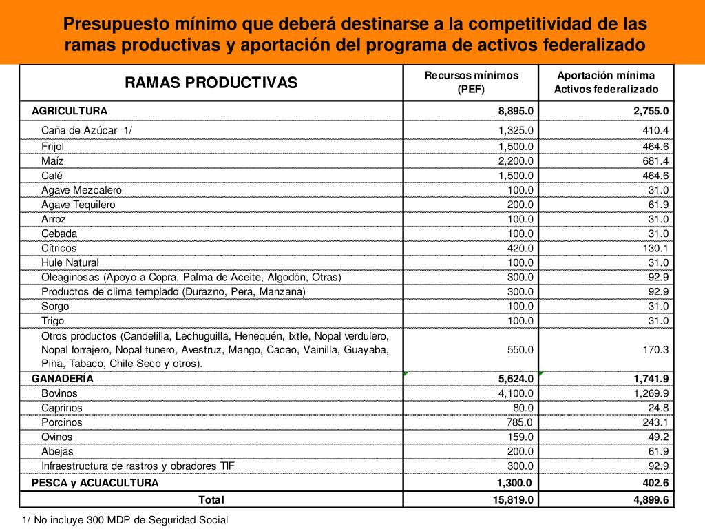 Presupuesto mínimo que deberá destinarse a la competitividad de las ramas productivas y aportación del programa de activos federalizado