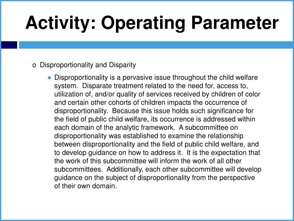 Activity: Operating Parameter • Disproportionality and Disparity • Disproportionality is a pervasive issue throughout the child welfare system. Disparate treatment related to the need for, access to, utilization of, and/or quality of services received by children of color and certain other cohorts of children impacts the occurrence of disproportionality. Because this issue holds such significance for the field of public child welfare, its occurrence is addressed within each domain of the analytic framework. A subcommittee on disproportionality was established to examine the relationship between disproportionality and the field of public child welfare, and to develop guidance on how to address it. It is the expectation that the work of this subcommittee will inform the work of all other subcommittees. Additionally, each other subcommittee will develop guidance on the subject of disproportionality from the perspective of their own domain.