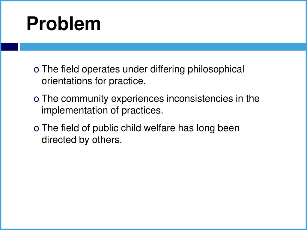 Problem • The field operates under differing philosophical orientations for practice. • The community experiences inconsistencies in the implementation of practices. • The field of public child welfare has long been directed by others.