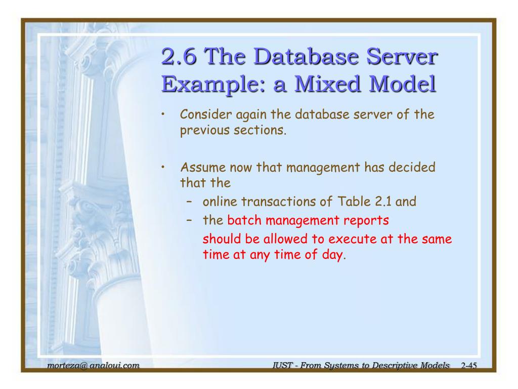 2.6 The Database Server Example: a Mixed Model • Consider again the database server of the previous sections. • Assume now that management has decided that the • online transactions of Table 2.1 and • the batch management reports should be allowed to execute at the same time at any time of day.