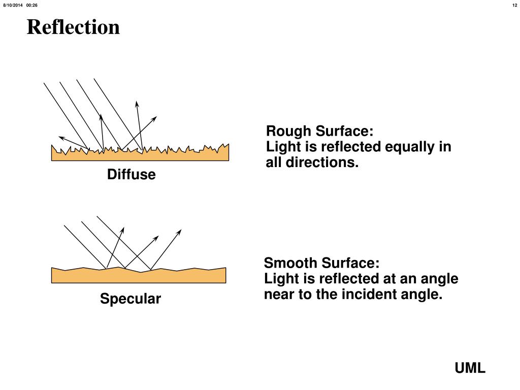 Reflection Rough Surface: Light is reflected equally in all directions. Diffuse Smooth Surface: Light is reflected at an angle near to the incident angle. Specular