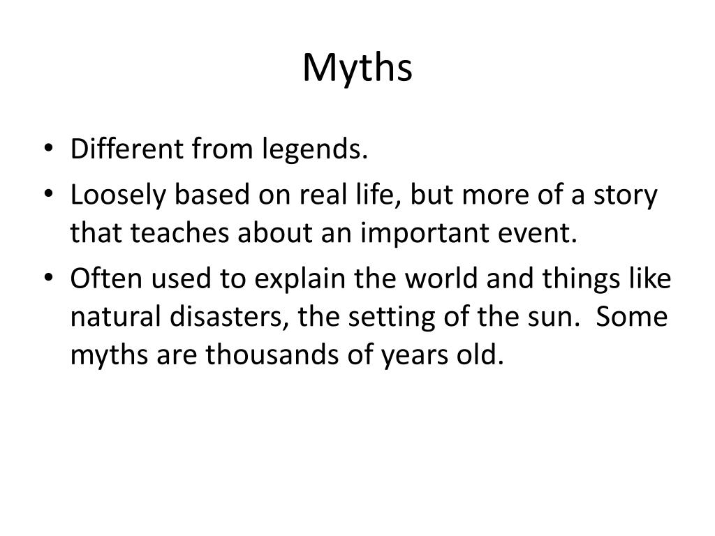 Myths • Different from legends. • Loosely based on real life, but more of a story that teaches about an important event. • Often used to explain the world and things like natural disasters, the setting of the sun. Some myths are thousands of years old.