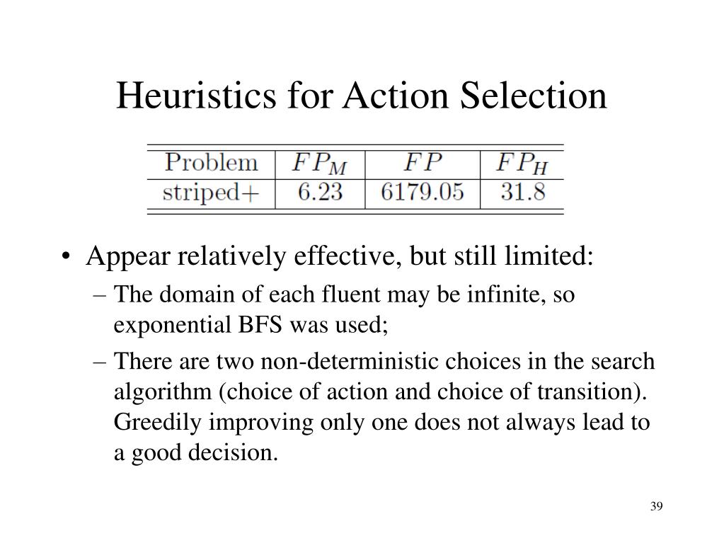 Heuristics for Action Selection • Appear relatively effective, but still limited: • The domain of each fluent may be infinite, so exponential BFS was used; • There are two non-deterministic choices in the search algorithm (choice of action and choice of transition). Greedily improving only one does not always lead to a good decision.