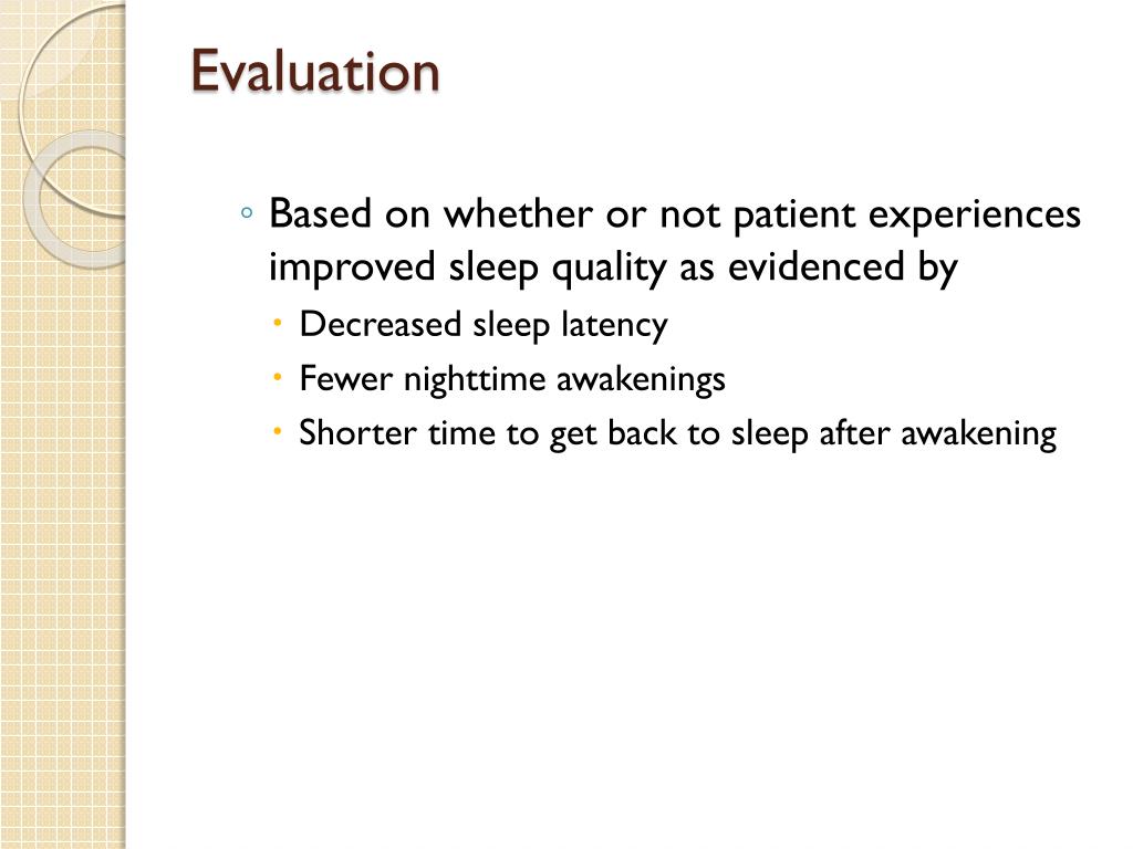 Evaluation • Based on whether or not patient experiences improved sleep quality as evidenced by • Decreased sleep latency • Fewer nighttime awakenings • Shorter time to get back to sleep after awakening