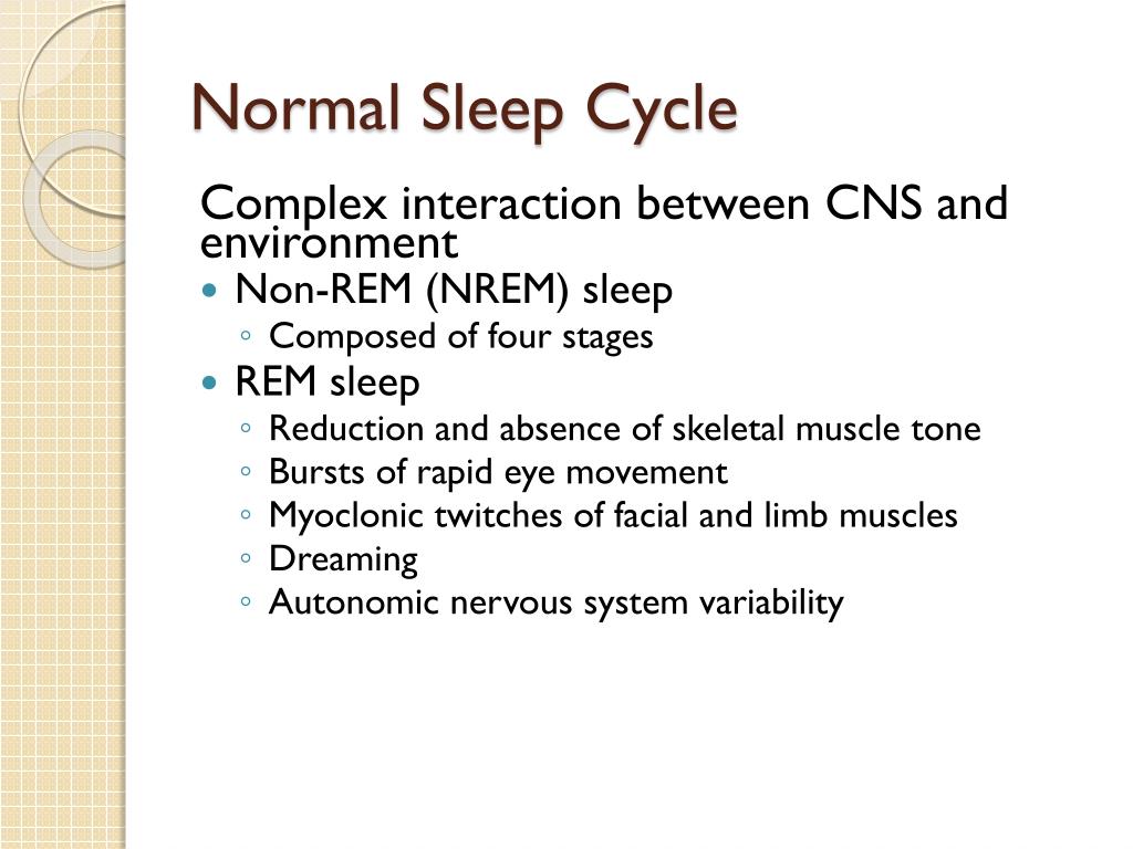 Normal Sleep Cycle Complex interaction between CNS and environment • Non-REM (NREM) sleep • Composed of four stages • REM sleep • Reduction and absence of skeletal muscle tone • Bursts of rapid eye movement • Myoclonic twitches of facial and limb muscles • Dreaming • Autonomic nervous system variability