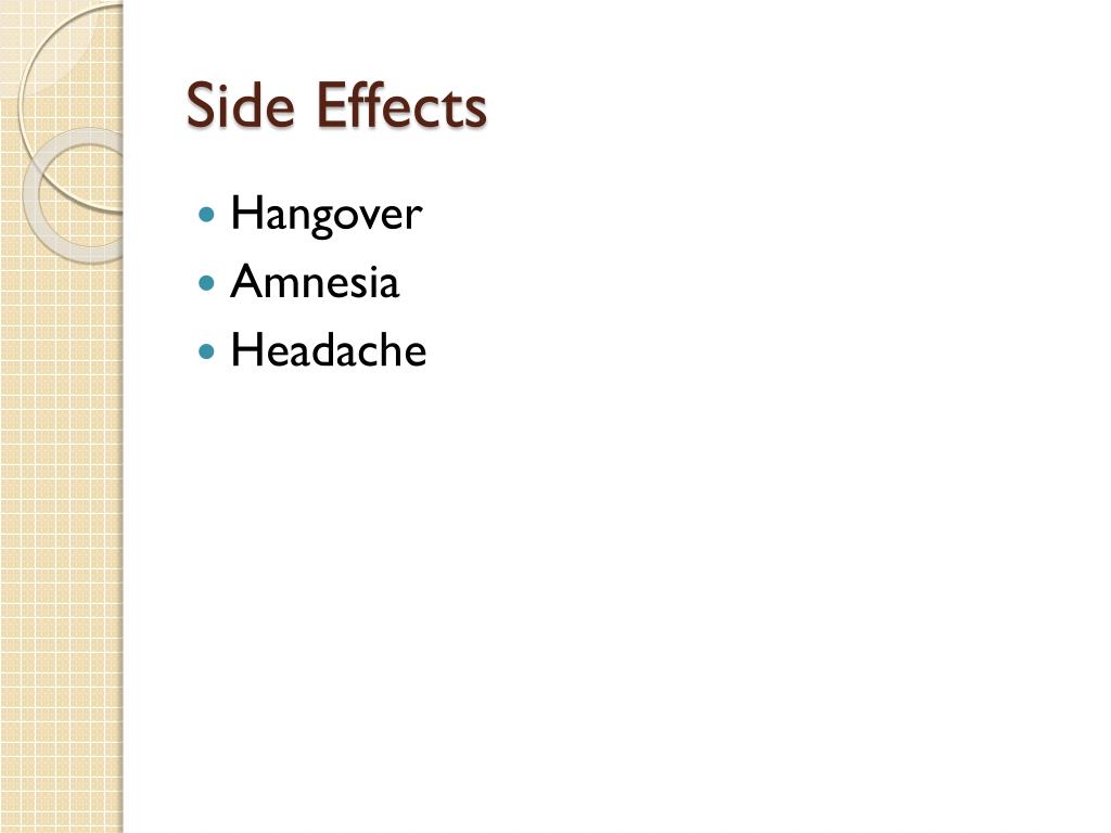 Side Effects • Hangover • Amnesia • Headache