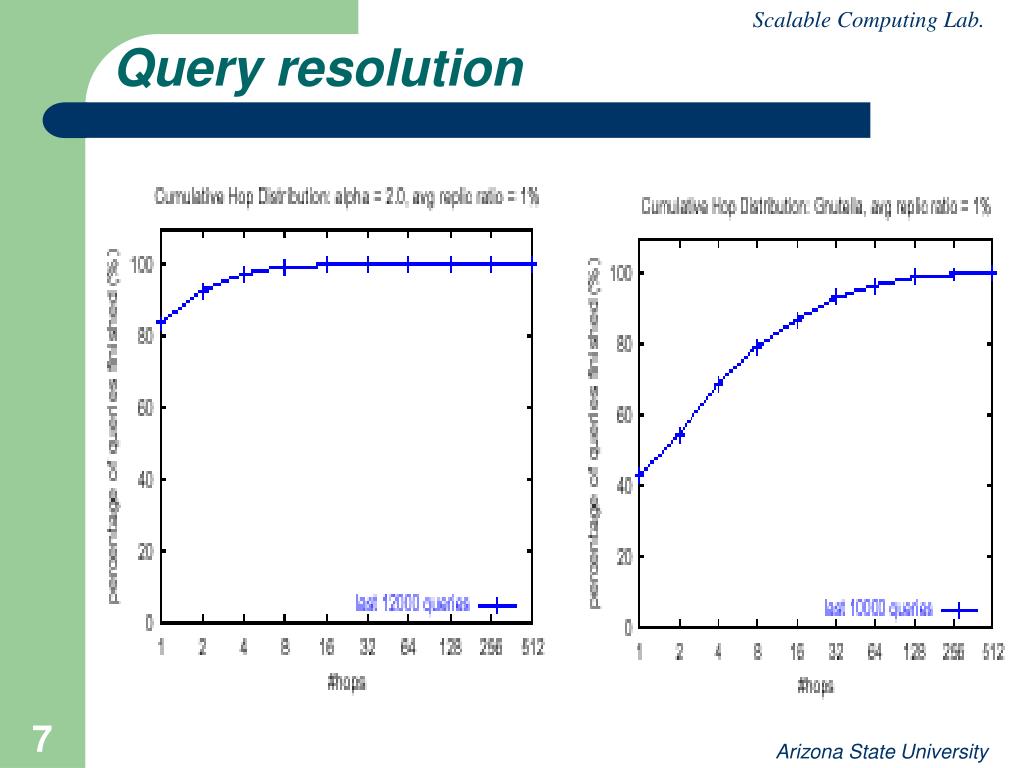Evaluation • Setup • =10, =1.25, T=100 seconds • Object popularity: Zipf-like distribution( = 1.2) • Query rate: poisson process(1.2 queries/min) • Node heterogeneity • Ci: Zipf-like distribution( = 2.0) • Bandwidth distribution: from measurement • Dial-up modem(a fair fraction), cable or DSL(majority), high speed(small portion) • Uniform random graph topology • For Zipf-like capacity distribution • 10000 nodes, avg. degree 9.9 • For Gnutella-like capacity distribution • 5000 nodes, avg. degree 7.5