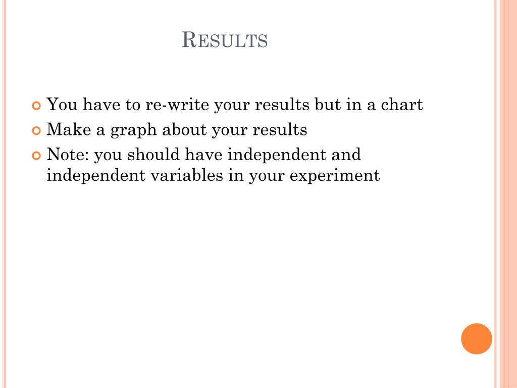 Results • You have to re-write your results but in a chart • Make a graph about your results • Note: you should have independent and independent variables in your experiment